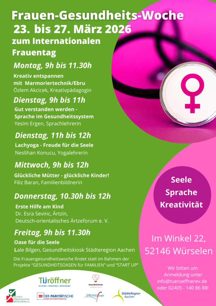 Wir laden Frauen zu einer Woche voller Impulse rund um Gesundheit, Wohlbefinden und Austausch ein. Die Veranstaltungen bieten praktische Tipps, kreative Angebote und informative Gespräche zu Themen wie seelische Gesundheit, Sprache im Gesundheitssystem, Familie und Erste Hilfe am Kind.