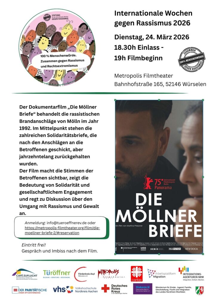 Im Rahmen der IWGR 2026 organisieren wir in Kooperation mit verschiedenen Partner:innen die Vorführung des Dokumentarfilms „Die Möllner Briefe“. Der Film erinnert an die rassistischen Brandanschläge von 1992 in Mölln. Im Mittelpunkt stehen Solidaritätsbriefe, die an die Betroffenen geschickt, ihnen jedoch jahrzehntelang vorenthalten wurden. Der Film macht ihre Perspektiven sichtbar und lädt dazu ein, über Solidarität sowie den Umgang mit Rassismus und rechter Gewalt ins Gespräch zu kommen.