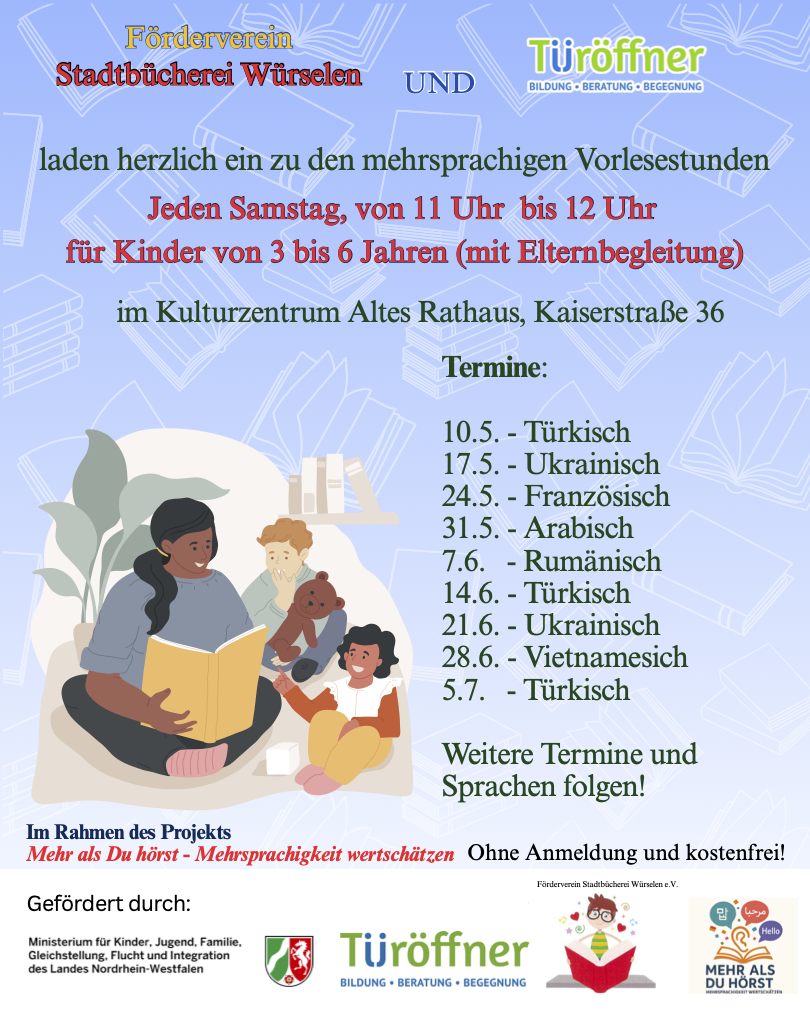 Im Rahmen des Projektes „Mehr als Du hörst – Mehrsprachigkeit wertschätzen“ finden jeden Samstag von 11 Uhr bis 12 Uhr mehrsprachige Vorlesestunden in der Stadtbücherei Würselen statt. Hier eine Übersicht der Sprachen bis zu den Sommerferien.