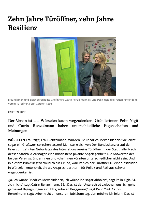 Presse- und Medienberichte Mitglied werden Spenden presseartikel Veranstaltungen Presseartikel 2026 2025 2024 2023 2022 2021 2020 2019 Auszeichnung 2014 Türen öffnen – Gutes tun – Spender werden 10€ 20€ 50€ 250€ Sonstiges FolgenFolgenFolgenFolgen